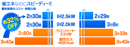 - 使用鍋24cm鉄ホーロー鍋、ラジエントはアルミ鍋/熱効率IH90%、クイックラジエント75%にて計算/ガスは実測値を参考例として記載/水温20℃、水1.0Lを90℃に沸かすための時間とコスト/新電力料金目安 単価22円/kWh(税込)/都市ガス167.8円/?(税込)/(社)全国家庭電気製品公正取引協議会基準ガス事業便覧(平成14年度版より)