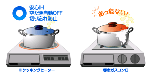 吹きこぼれの油の引火、ヒヤッとしたことはありませんか? IHなら引火する火を使わないのでそんな心配は必要ありません。その上、安全機能が付いているので、 小さなお子様やお年寄りの居られるお宅にもぴったりです。