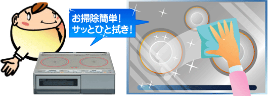 鍋や調理機材を直接発熱させることにより、漏れ火もなく、上昇気流も少ないので調理の際の油の飛び散りが抑えられ キッチンまわりをきれいに保つことが可能です。 また、燃焼ガスによる換気が不要ですので冷暖房のロスもカット!! 現在増え続けている高気密、高断熱住宅の必需品となっていくといわれています。